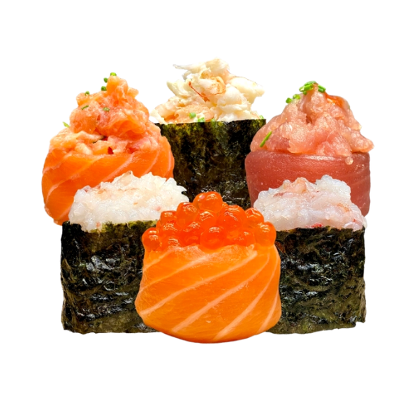 Sake, Maguro, Ebi, Amaebi, Kai, Ikura (salmone, tonno pinne gialle, gambero cotto, scampo, gambero rosso, uova di salmone)