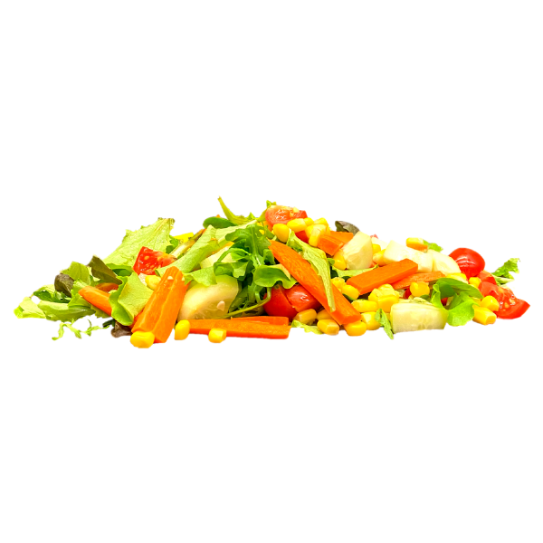 Insalata misticanza, carote, pomodorini ciliegino, cetrioli, mais e vinaigrette Banshi