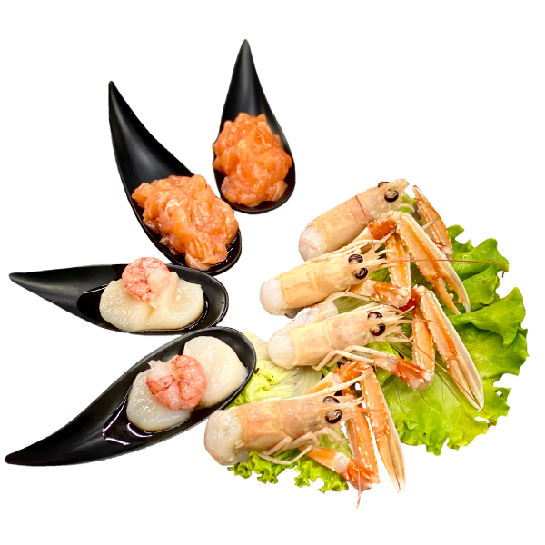 3 scampi, 2 mini tartare di salmone e 2 cappesante accompagnate da gamberi rossi di Sicilia e guarnite con riduzione di salsa Banshi