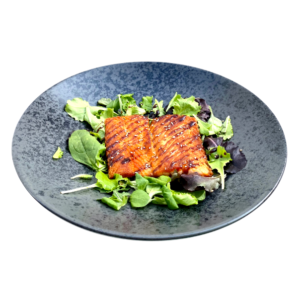salmone alla piastra su letto di verdure, salsa teriyaki e sesamo