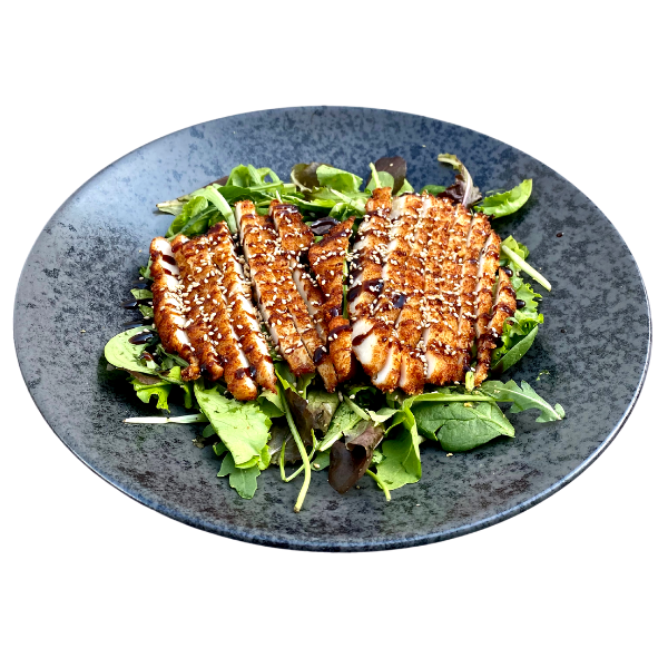 Tagliata di pollo in tempura su letto di verdure, salsa teriyaki e sesamo