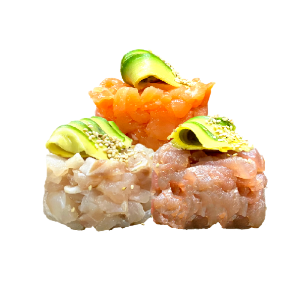 3 mini tartare di salmone,tonno pinna gialla e branzino