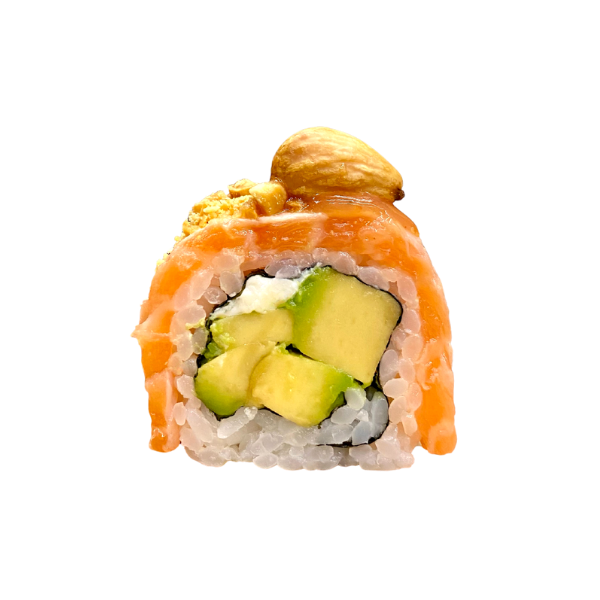Avocado e philadelphia, sopra salmone flambé e riduzione di salsa alle fragole e mandorle tostate