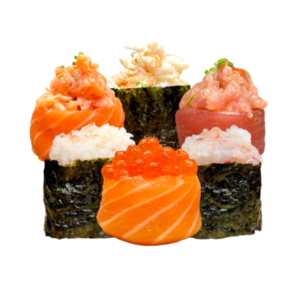 Sake, Maguro, Ebi, Amaebi, Kai, Ikura (salmone, tonno pinne gialle, gambero cotto, scampo, gambero rosso, uova di salmone)