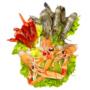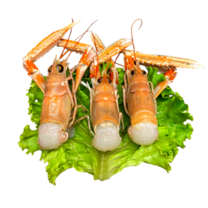 3 gamberi rossi di Mazara del Vallo, 3 scampi e 3 gamberi blu della Nuova Caledonia su letto di insalata gentile