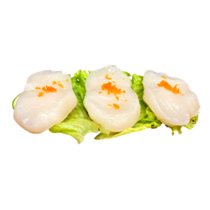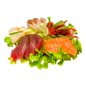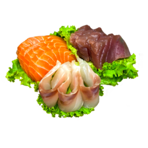 3 fette di salmone, 3 fette di tonno, 3 fette di branzino 3fette di cappasanta  e 3 gamberi rossi di Sicilia